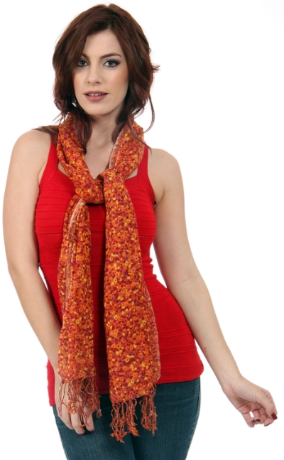 A garden of miniature red & yellow flowers blooms on this 100% wool weave of warm colored scarf finished with long twisted fringe at its ends. Imported. Dry clean only.
