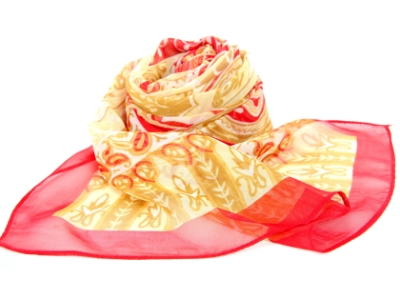 Beautiful Printed scarf in red with artistic pattern in gold comprising of paisleys, leaves & flowers. Lightweight & matches with any kind of outfit. 60% polyester and 40% silk.