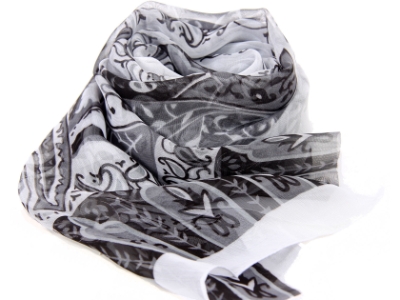 Beautiful printed scarf in white with artistic pattern in black comprising of paisleys, leaves & flowers. Lightweight & matches with any kind of outfit. 60% polyester and 40% silk. Hand wash.
