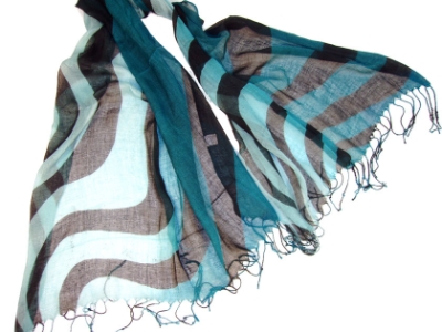 Lightweight Shaded Polyester scarf in shades of Teal Blue with Black waves over it. Fringes on its ends. Imported.