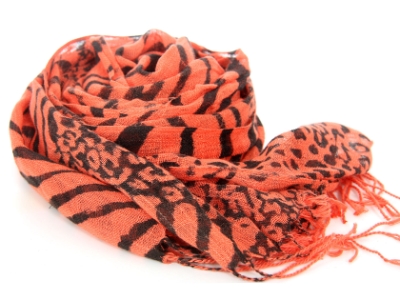 Zebra & Leopard Print in black over 100% viscose scarf in bright orange color. Long fringes on the ends. Imported.