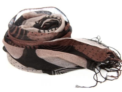 Lightweight black 100% viscose scarf with patterned circular print in shades of brown. Thin long twisted fringes on the ends of this scarf. Imported.