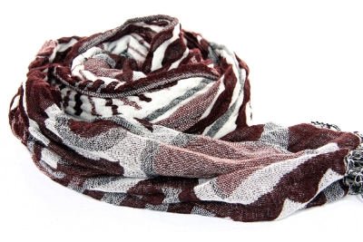 This artistically patterned 100% Polyester scarf in brown & beige colors is double layered and super soft to use. This retro scarf can be teamed with any kind of outfit. Thin fringes on the edges adds that extra zing to it. Imported.