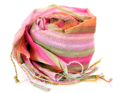 Multi Colored Stripes in shades of fuchsia, green, pink, orange colors spread over this lightweight & long scarf. Stitches like embroidery all along the stripes decorates this little shiny 100% polyester scarf. Long twisted fringes on its ends. Imported. Hand wash.