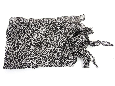 This leopard print 100% polyester scarf can add style to any kind of outfit during day or night. Asymmetrical ends with leaves like cut-out pattern. Very big in size so can be used in multiple ways as a cover-up, shawl or simply as a scarf. Imported.