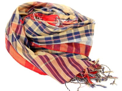 Navy colored plaids print covers this shiny gold colored 100% polyester scarf. Red border along the vertical edge of scarf & thin twisted fringes at the edges. Imported. Hand wash.