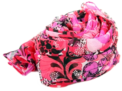 Floral print lightly textured scarf in shades of pink & black can enliven any kind of outfit. Can be used in multiple ways all year around. 100% polyester. Imported. Hand wash.