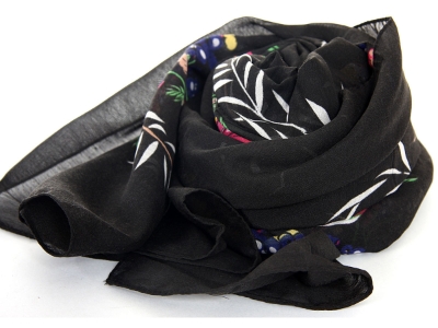 100% polyester scarf in floral design. Main color in Black. Hand washable. Size is approximately 72x40 inches. Made in India.