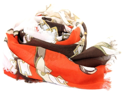 Chains print in different shapes & sizes on this white colored 100% polyester scarf which also has coffee & orange colors. Eyelash fringe on all sides completes this scarf & can make any outfit look classy. Imported. Hand wash.