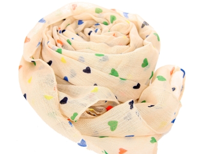Miniature Hearts Print in multi colors covers this 100% polyester scarf which is pretty big in size to be used as a shawl or around the neck. Imported. Hand Wash.