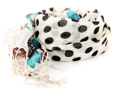 Black Polka Dots lends unmistakable style to this 100% wool scarf that is both lightweight & cozy. Blue & brown floral print at the ends of the scarf with hanging fringe. 100% wool. Hand wash. Imported.