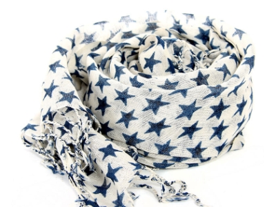 A cozy knit ivory colored scarf is styled with blue stars all over it & soft swingy fringe at the ends. 100% wool scarf. Imported. Dry clean only.