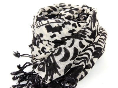 This 100% wool scarf in ivory color has artistic abstract figures print on it in black color. Has twisted fringes at its edges. Imported. Dry clean only.