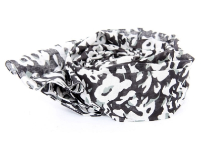 Black 100% cotton scarf with white floral print on it. This breezy lightweight scarf is a must have all year around. Imported. Hand wash.