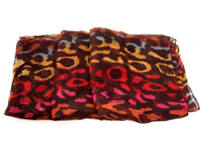 Semi-sheer brown polyester scarf with multi colored abstract print. Big size of the scarf makes it possible to be used as a shawl, wrap or scarf around the neck. Imported. Hand wash.