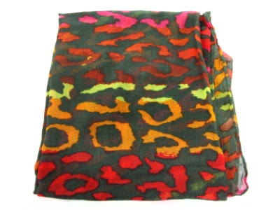 Semi-sheer hunter green polyester scarf with multi colored abstract print. Big size of the scarf makes it possible to be used as a shawl, wrap or scarf around the neck. Imported. Hand wash.