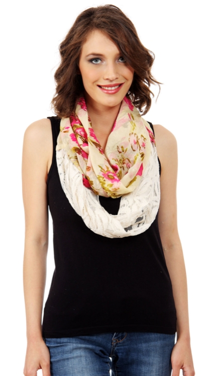 Floral pattern ivory colored lace patch adds textural contrast to this lightweight floral print Infinity Scarf which is soft & breathable to be used all year around.