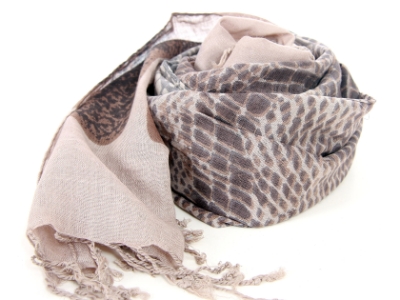 Yarn dyed 100% viscose scarf in light brown color with brown snake like print on it. Twisted fringes on the ends of it. Imported.