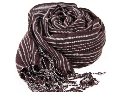 Long twisted fringe decorates the ends of this lightweight coffee colored viscose scarf with white stripes woven into it. Imported.