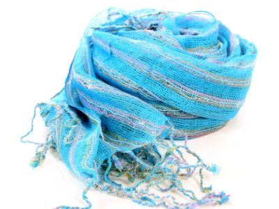 Yarn Dyed 100% viscose open weave scarf in bright turquoise color with tinge of pink & green colored stripes can enliven any mood & outfit. Thin twisted fringes at its edges. Imported.