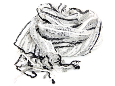 White open weave scarf in yarn dyed 100% viscose with black & grey stripes running through it. Sheer scarf has twisted fringes on its edges. Imported.