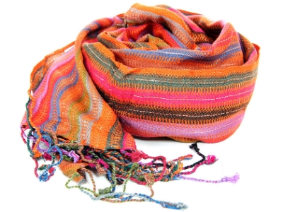 Yarn dyed 100% viscose open weave scarf in vertical striped pattern with orange stitching like stripes also. Thin silver lining also runs in between colored stripes. Imported.
