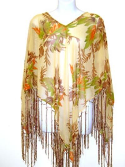 Gold colored 100% rayon material V-Neck poncho top with brown & green leafy print with long hanging satin threads at its edges. Imported.