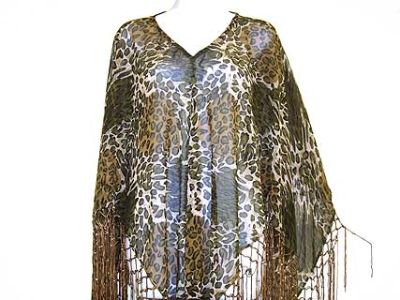 Leopard print v-neck poncho is made of sheer rayon material. Hanging fringes on its border in satin thread material. Imported.
