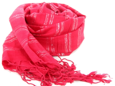 Yarn dyed 95% viscose scarf with 5% metallic silver horizontal stripes along its breadth and twisted fringes on its edges. Hand Wash. Imported.