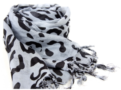 Cow print in black over 100% viscose scarf in shades of grey & silver. Threads like long fringes on the ends of the scarf. Imported.