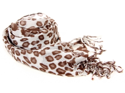 Off-white 100% viscose scarf with brown leopard print on it. Loose threads like fringes with knots on the edges of the scarf. Imported. Hand wash.