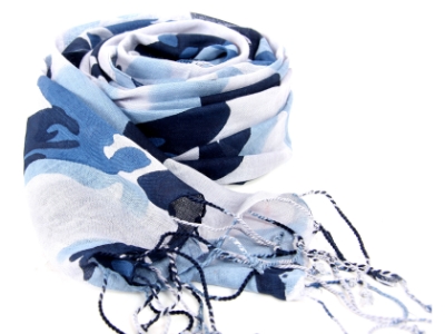 Abstract print 100% viscose scarf with long twisted fringes on its ends. This scarf has a mix of shades of blue over white background and is lightweight & soft to use and can be worn all year around. Imported. Hand wash.