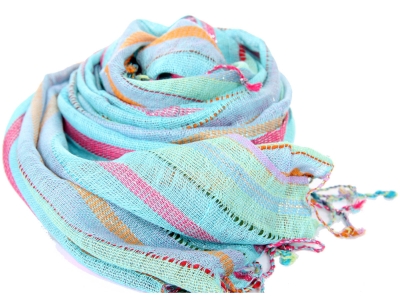 Open Weave Viscose Scarf in Turquoise color with Multi Colored Striped Pattern. Woven stripes make multicolored fringes on the ends of the scarf. Imported. Made of 95% viscose and 5% metallic.