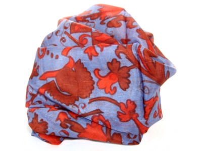 This periwinkle blue 100% silk scarf has garden inspired print in red. Very lightweight & soft to use. Made in India.