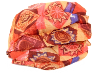 Artistic diamond shape print with shining sun in shades of mustard, coral & brown. 100% silk square scarf is lightweight & a must have all year around. Made in India.